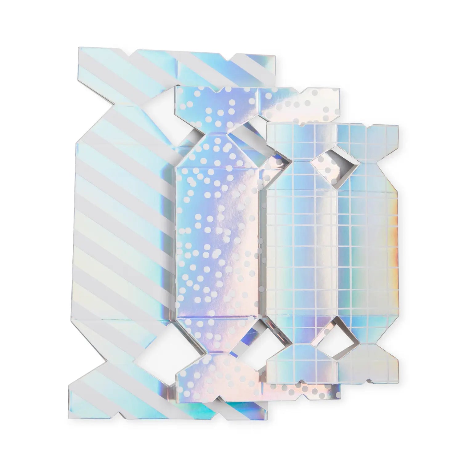 Ready-to-fold treat boxes make DIY party favors a piece of cake. 6 Boxes. Two of each pattern S: 2.5" wide x 1.5" tall. M: 3.5" wide x 1.5" tall. L: 4.5" wide x 2" tall.