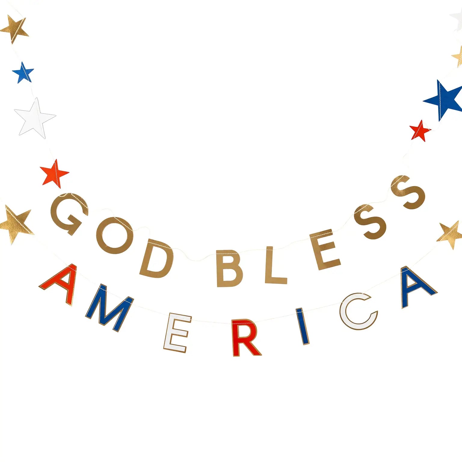 Add a classic touch to patriotic flair to your space this Fourth of July with this God Bless America banner set. This die cut word banner comes in two pieces that make creating festive focal point for your space a snap! And with die cut stars and gold foil accents this banner set will look amazing strung from your mantle, as part of a patriotic display, or any Fourth of July gatherings that you have planned this summer.