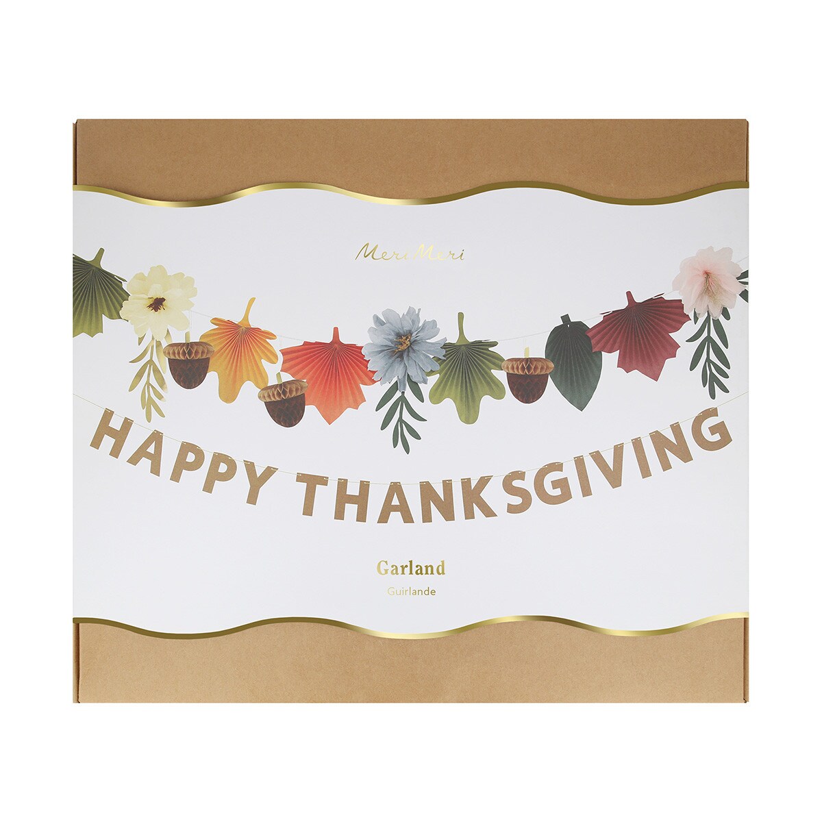 - Garland 2 has kraft card letter pennants spelling out Happy Thanksgiving, with the letters attached to a metallic gold cord