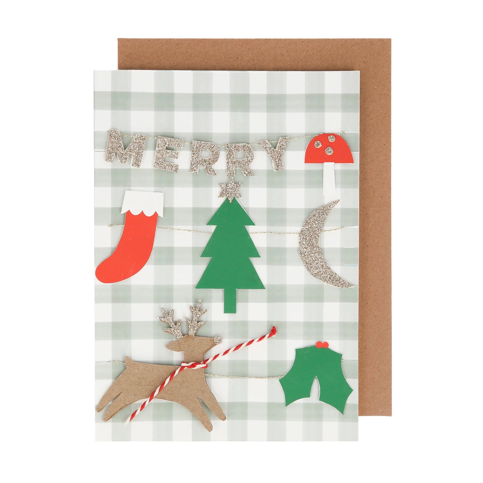 Is it a card, is it a garland? It's both! Simply remove the beautifully designed and crafted garland, with festive icons and glitter details, from the card and hang it up. There is another separate garland too, with a "Merry Christmas" message, so double the decorative effect!
