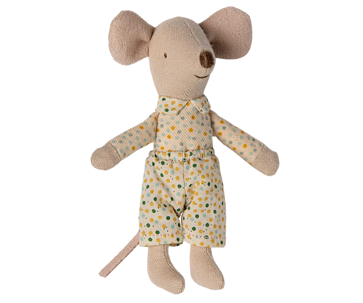 A classic Maileg item. This mouse is ready for hours of play and sleeps tight in the little matchbox. The clothes and bedlinen are made of soft fabrics with unique prints in beautiful colors. Extend the story by adding accessories to the play.