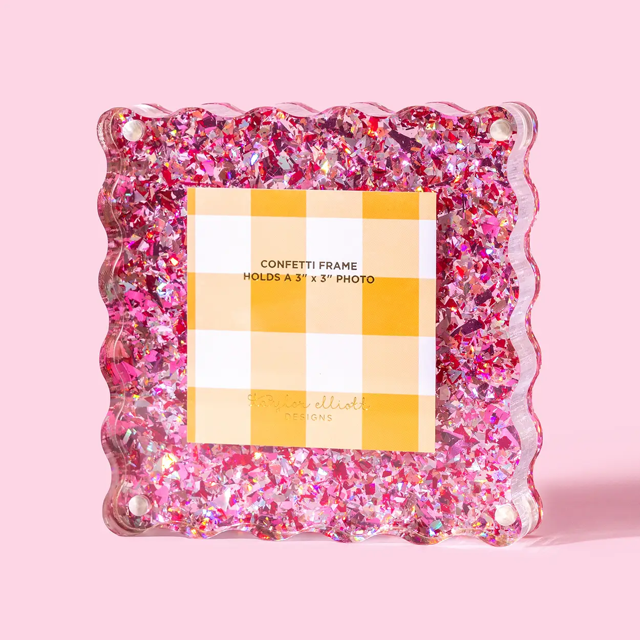 Back piece is pink confetti, front piece is clear acrylic